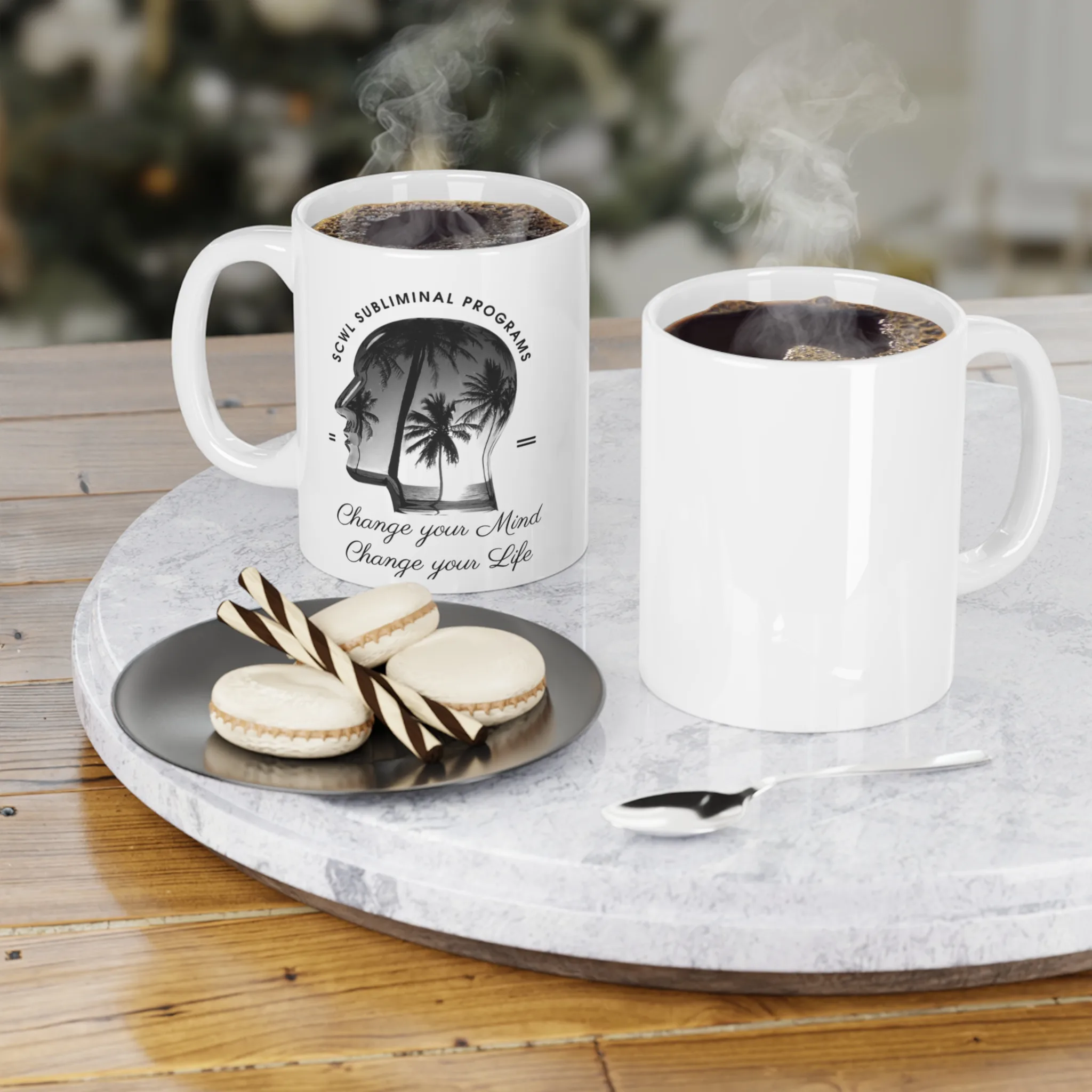 SCWL Subliminal Programs Ceramic Mug — “Change Your Mind, Change Your Life” with a Tropical Silhouette